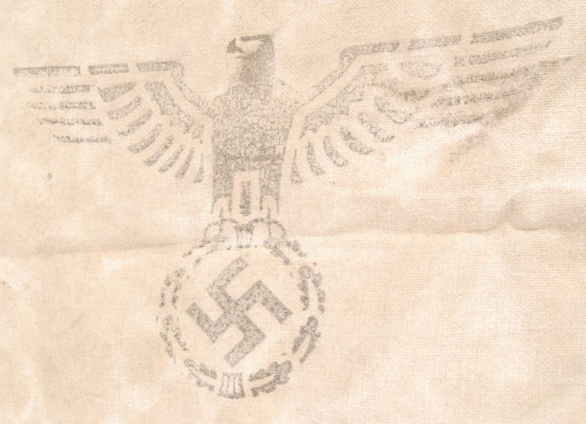 A WWII Second World War German Nazi Third Reich cloth grain sack with the eagle atop a wreathed Swastika and the reverse stamped ' H. Vpfl. 1943 '. Measures; 107cm x 74cm.
