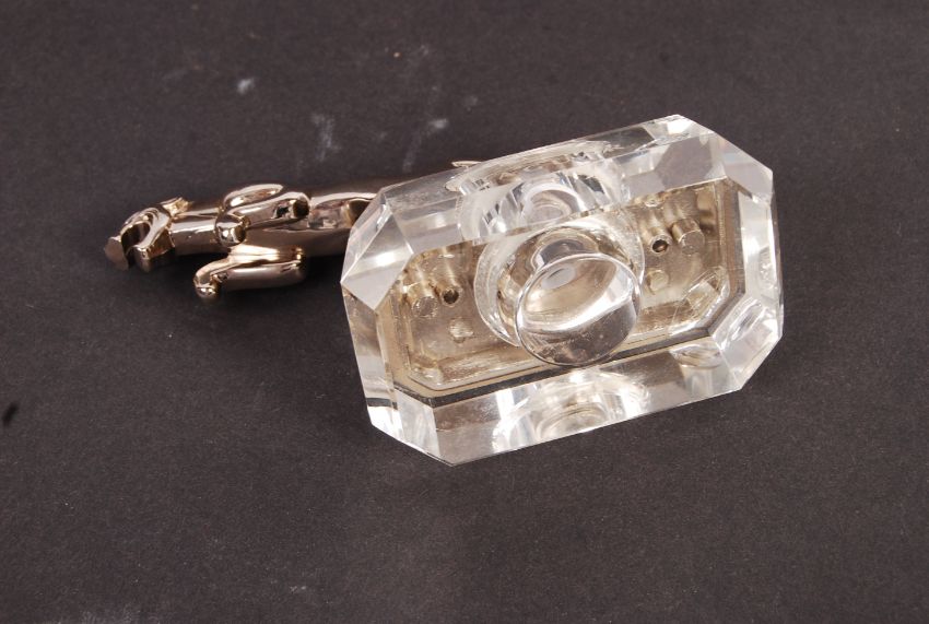 An original vintage desktop paperweight in the form of chromed Jaguar classic car radiator hood ornament mascot depicting the leaping Jaguar cat raised on a clear faceted Lucite base being engraved ' Jaguar '. Measures; 14cm long.
