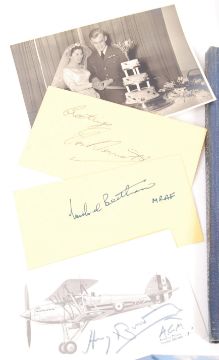 An interesting collection of WWII Second World War related ephemera, to include; a collection of WWII Pilot autographs - each signed to a postcard, comprising; Peter Townsend, Sandy Johnstone, and otehrs, with some adding extra notation. Along with a 1944 edition of 'The Aircraft Recognition Manual'. Interesting collection.