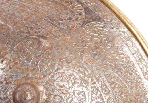 A stunning Qajar Dynasty Persian koftgari silver inlaid steel Dhal shield and matching Bazu Band / arm plate. The shield being of low convex form having heavily decorated in a foliate design, calligraphic border, brass rim and four central bosses corresponding with the enarmes. The Bazu Band being hevily decorated in foliate design with koftgari silver inlay. Shield measures; 46cm.