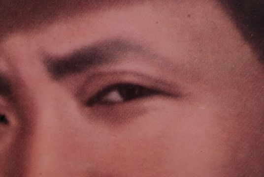A rare printed portrait on milk glass depicting a young Chairman Mao Zedong Chinese Communist Party Leader of The People's Republic Of China PRC (1893-1976) when he visited Northern Shaanxi in 1936. The heavy glass panel set to a wooden frame. Frame measures 64cm x 47cm.