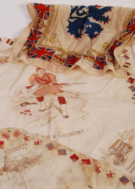 An interesting collection of original WWI First World War related items, to include x4 period silk / cotton propaganda / commemorative handkerchiefs ' For King & Country ' 'Britains Glory ' etc, along with various real photographic and artist-type WWI postcards, a brass button polisher and other items. Interesting assortment.