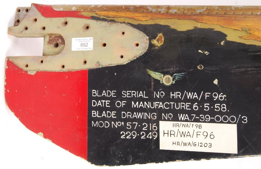 An original rare vintage 1958 wooden rear rotor blade from an early RAF Royal Air Force Whirlwind helicopter. The rotor blade being multicoloured, and marked with its serial number and date of manufacture (6-5-58). Hordern Richmond makers stamp above details. Rare item. Measures approx 107cm long.