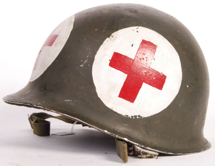 A WWII Second World War era US United States of America M1 first pattern infantry steel combat uniform Medic helmet complete with liner and all strapping. The exterior in khaki green with four white painted circles with red cross to each.