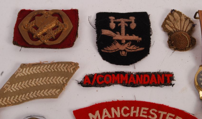 A collection of assorted original WWII Second World War and related uniform cloth patches, cap badges and wristwatches. Cloth patches include; British Airborne Forces Winged Pegasus patch, Manchester Regiment shoulder title, Norfolk Regiment, etc. Cap badges include; Royal Artillery, Royal Corps Of Signals, and RASC etc. An interesting collection.