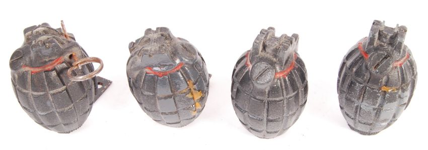 1917 (2019) - Directed by Sam Mendes - set of x4 movie prop mills bomb hand grenades. Resin construction, with mounting brackets to base. Some with pins, others without. Likely used as background decoration during some of the trench scenes. Provenance; purchased by our vendor from one of the prop making companies associated with the film.
