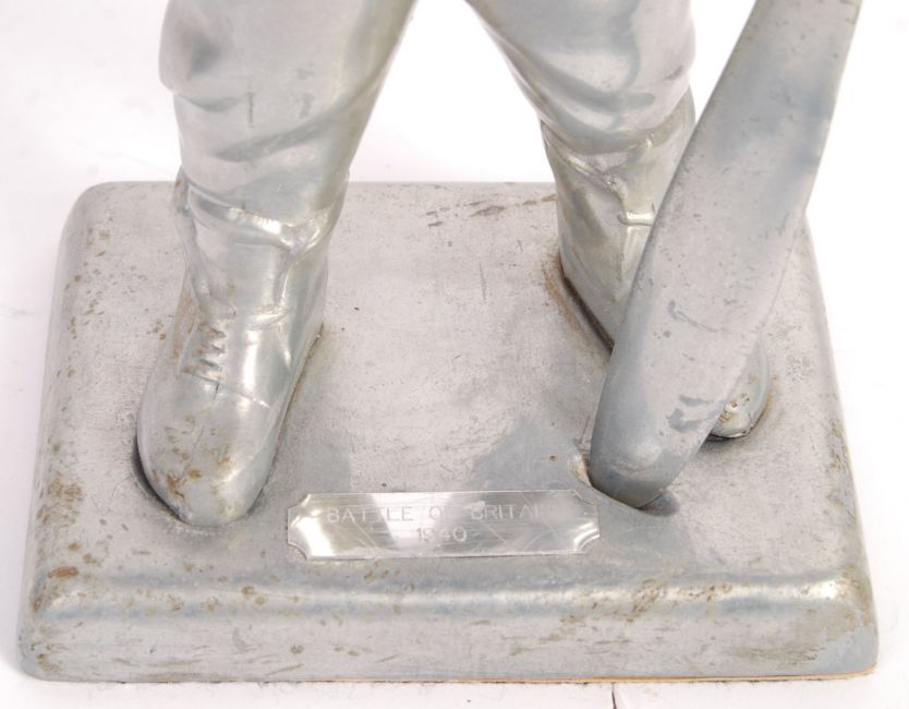 An incredible rare WWII Second World War mid-century aluminium presentation tabletop cigarette lighter. The lighter in the form of an RAF Royal Air Force pilot / crew member in full uniform, holding a propeller. The figure mounted on an aluminium base with ' Battle Of Britain ' plaque to front. The neck hinged to reveal a cigarette lighter. Believed to be a presentation item. Rare. Measures approx; 27cm tall.