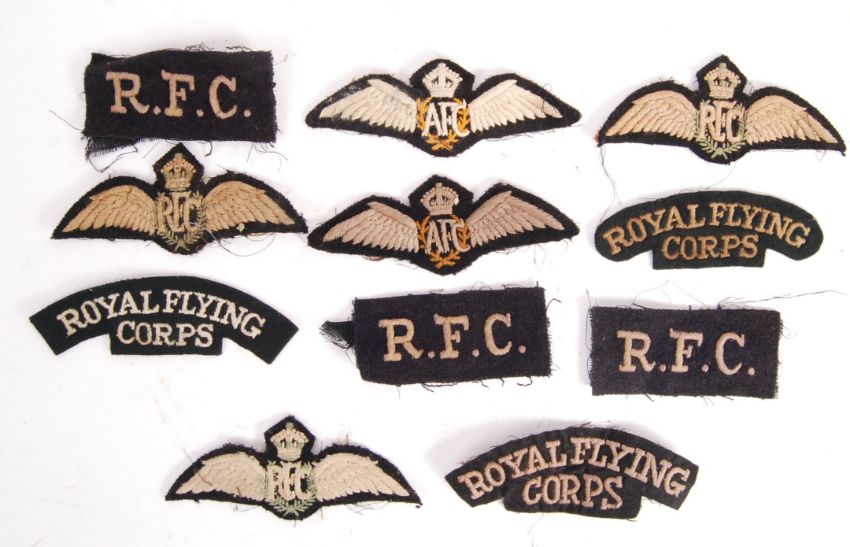 A collection of 11x original WWI First World War era Australian Flying Corps and Royal Flying Corps uniform cloth patches. Various forms and designs, including RFC and AFC cap patches, shoulder titles etc. Interesting collection.