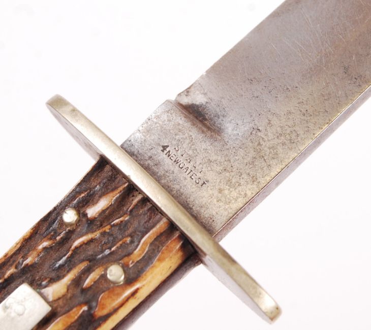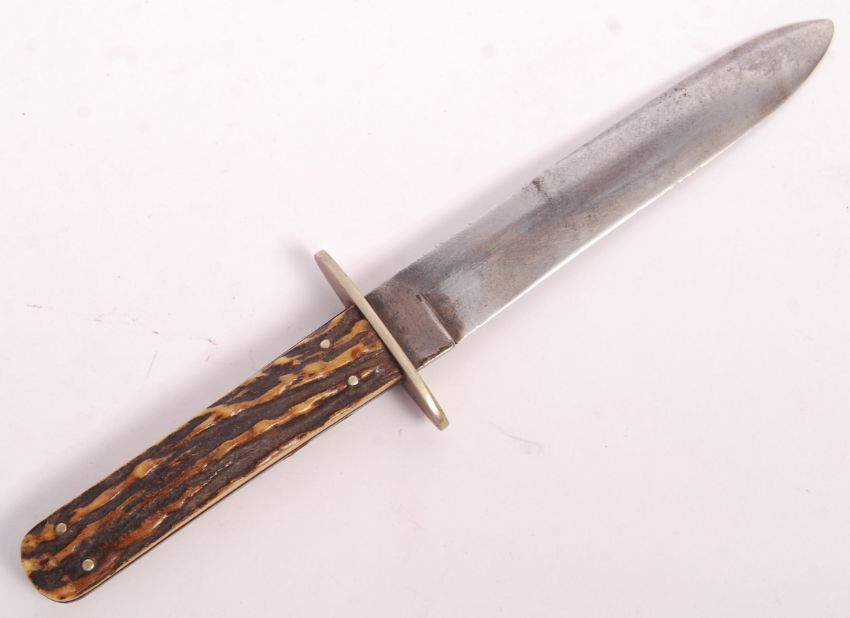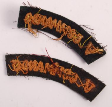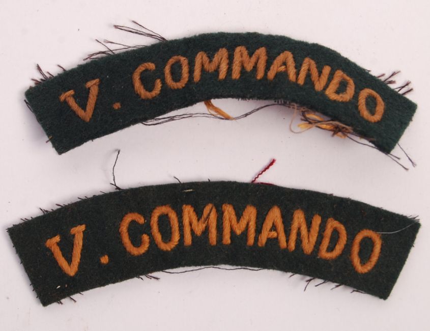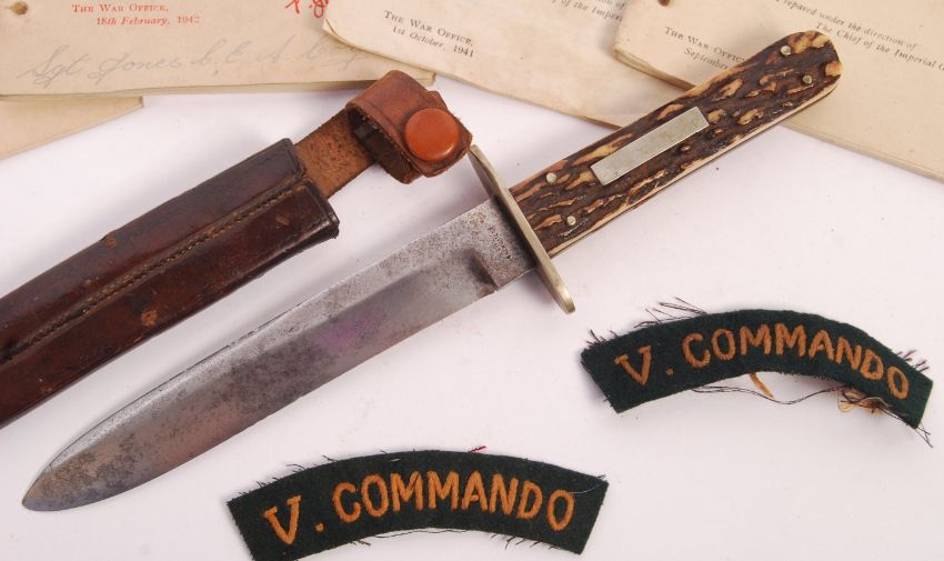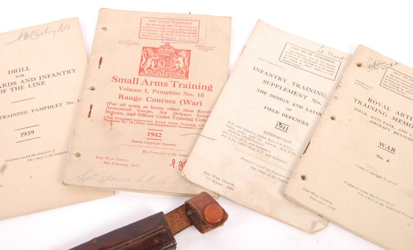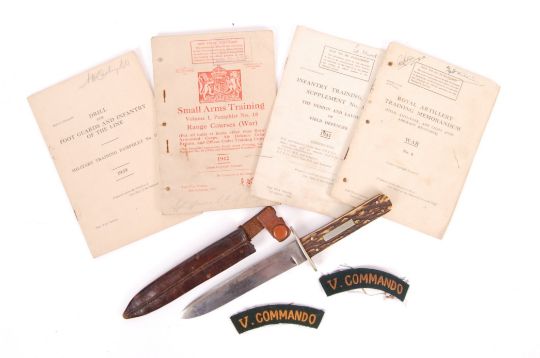 An interesting collection of original WWII Second World War British Commando related items. Including x2 ' V. Commando ' should titles / patches, along with an original fighting / combat dagger by Stacy of London - with horn handle and original leather scabbard, and four WWII Army booklets - Small Arms Training, Infantry Training, Royal Artillery Training and Drill For Foot Guards & Infantry Of The Line (unrelated). Interesting collection.