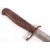 A WWI First World War Imperial German trench / boot / fighting knife having a wooden ribbed and shaped grip, knuckle guard, forward facing quillon, double edged blase, steel scabbard and leather belt frog. Marked with crown above a snake wrapped around a staff being the mark for Aesculap Tuttlingen. Measures; 28cm