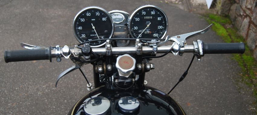 A stunning example of a Vincent Black Shadow motorcycle. 20,000 genuine miles, and fully registered with the Vincent Owner's Club. Matching frame numbers, and also matching casing numbers. Fitted with all the period extras - a hand operated centre stand, a rev counter, electronic ignition, uprated carbs, electric start, and very expensive rare four leading shoe brakes.