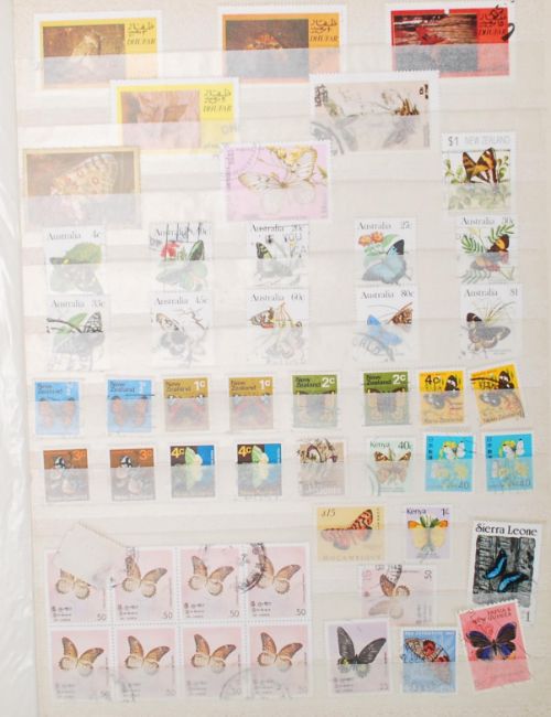 A collection world stamps dating from the 19th Century with pre decimal and decimal examples, GB examples, with many flower, moth and butterfly examples. The stamps across various albums. Measures 31 cm x 25 cm.
