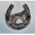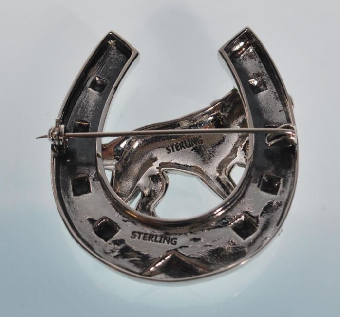 A large sterling silver brooch in the form of a horse shoe. An engraved dog is placed over the horseshoe. Measures: 5 x 4.5 cm. Weight: 24.2g.