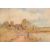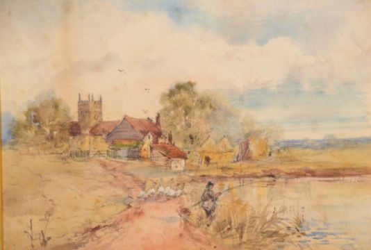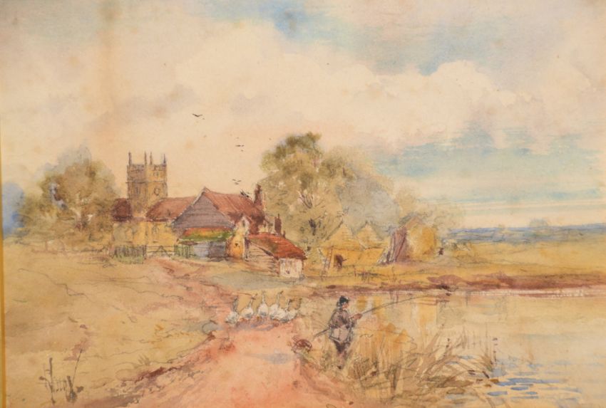 George Dunkerton Hiscox. A 19th Century Watercolour painting. The scene depicts a fisherman at the side of a pond or lake. Geese walk behind him to the waters edge and a church can be seen in the village beyond. Picture is signed. Measures 38 cm x 44 cm.
