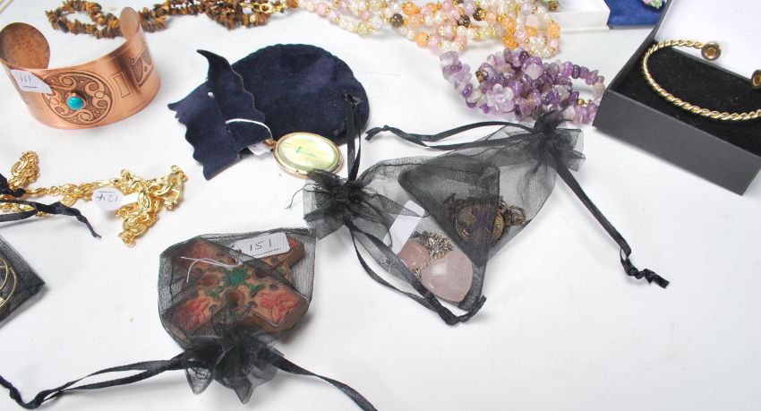 A large collection of vintage costume jewellery mostly being contained in original packaging to include a selection of demi parure sets, a copper bangle set with a turquoise cabochon, a good selection of yellow and white metal pendant necklaces, a ceramic floral brooch and tie pin, simulation pearls, a crucifix necklace, a set of rosary beads, a purple semi precious stone necklace, and more, please see images. All housed within a vintage suitcase.