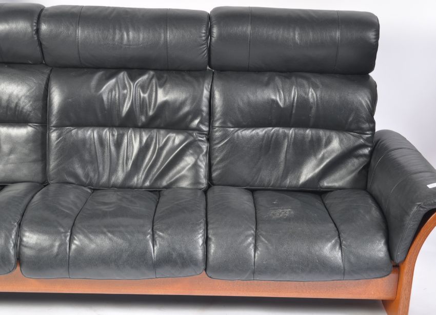 Ekornes Buckingham - Stressless - An original contemporary late 20th Century retro vintage sofa settee having teak wood sides with black leather arm cushions and seats. Each having separate reclining backs. Measures 102 cm high x 240 cm wide x 70 cm deep.