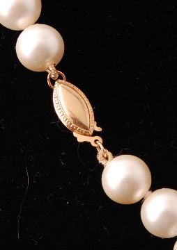 A good cultured pearl necklace set with a 9ct yellow gold clasp of lozenge form. Complete in the original presentation box. Length 16"