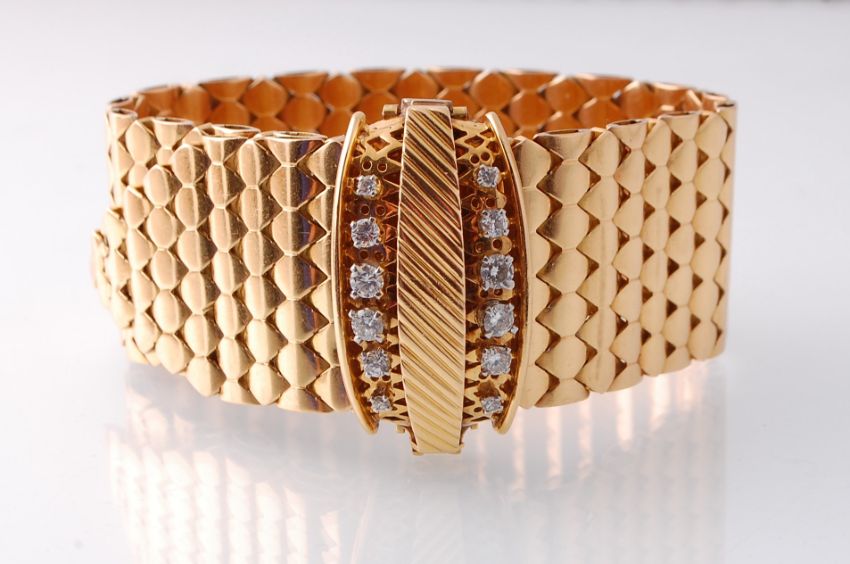A French Art Deco 18ct Gold and diamond buckle bracelet. The bracelet fashioned in the form of a belt having articulating diamond shaped links to a domed buckle clasp. The clasp being set with 12 round brilliant cut diamonds. Estimated diamond weight 0.60cts. Weight 81.6g. Measures 9 1/4 inches.