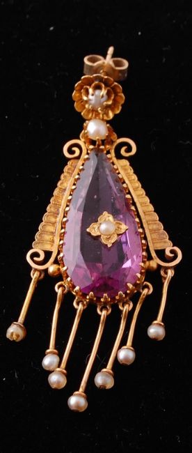 A pair of 19th century gold paste and pearl tassel earring. The earrings constructed of a central large amethyst paste faced drop embellished with gold scrolls with pearl studded cross, surmounted by pearl studs and strung with pearl terminated tassel completed with latter stud fasteners. Un marked tests indicate gold embellishments and mounts. Measures drop approx 2 inches. Weight 9.9g