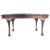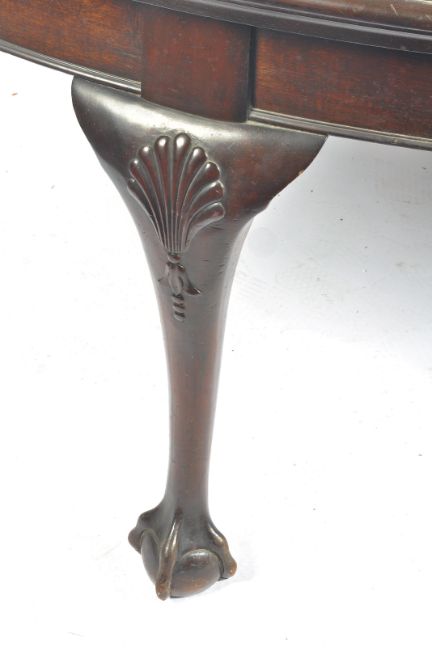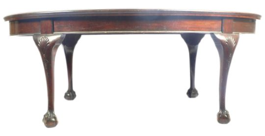 A early 20th Century Regency Revival mahogany library table of oval form having a detailed leather top with chamfered table top. Raised on ball and claw feet with shell and swag decoration. Measures 77cm x 197cm x 121cm.