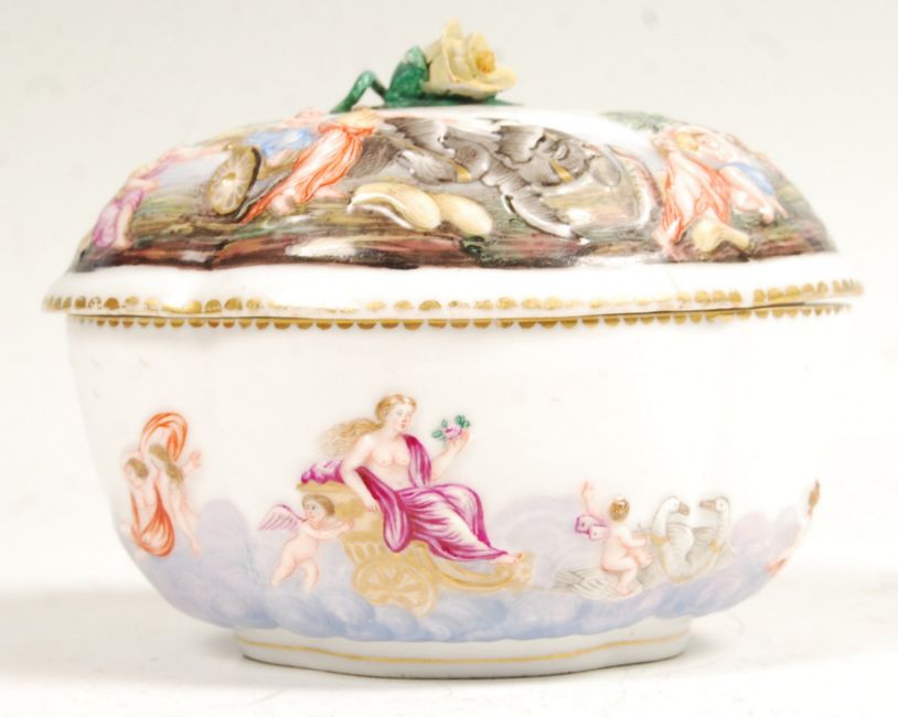 A 19th Century Italian Naples Capodimonte lidded pot of scalloped ovoid shape. Hand decorated with relief scenes depicting classical nude figures, trees, animals and musicians. The lid having floral finial. Painted Naples mark to base. Measures: 12cm.Condition: Repair to lid.