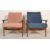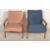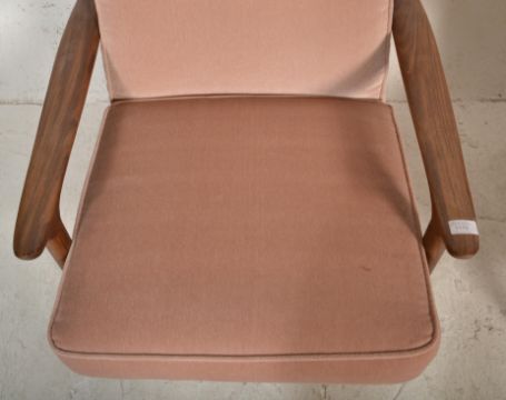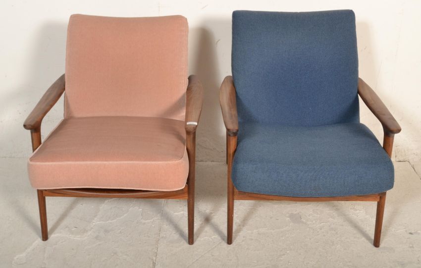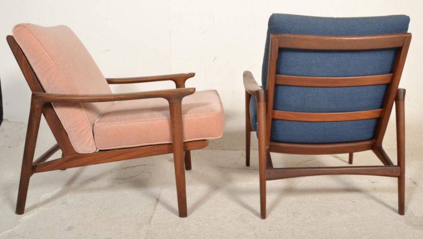 A stunning pair of retro vintage 20th Century Danish teak wood low easy lounge chair / armchairs in the manner of Greaves and Thomas. The chairs having teak shaped show wood arms and frame. The cushioned seat and backrest, one upholstered in a blue fabric and the other pink. Measures 77cm tall by 67cm wide and 82cm deep.