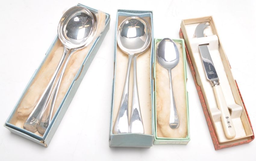 A collection of silver plated wares to include two cutlery canteens including one being wooden cased with cutlery in its original packaging, silver plate trays and dishes, boxed spoons and flatware, a selection of souvenir spoons etc.