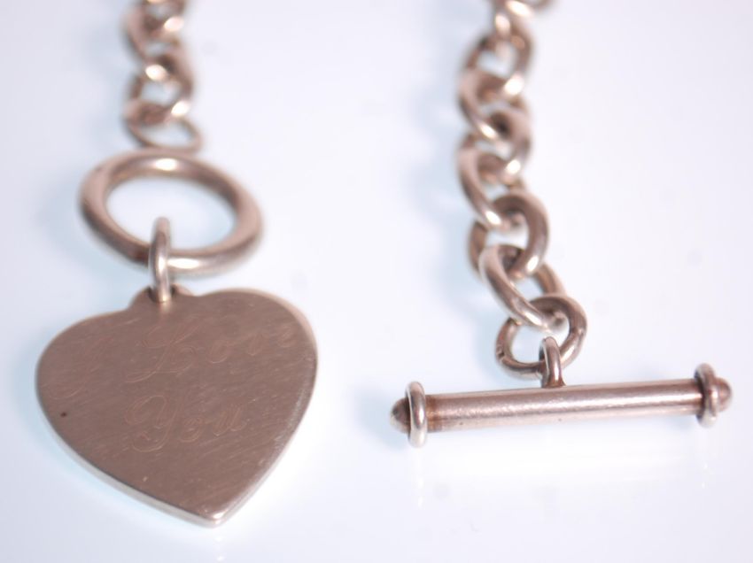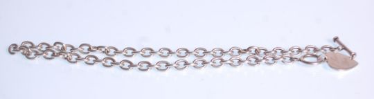 A silver necklace having an oval link chain with a toggle clasp and heart pendant. Measures 19 inches. Weight 64.5g.