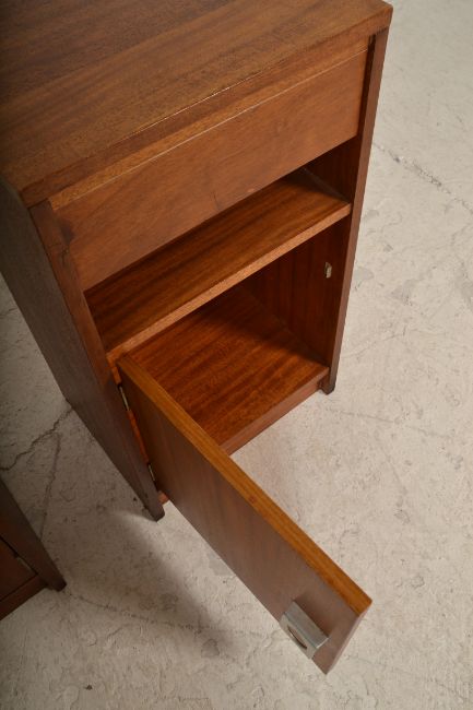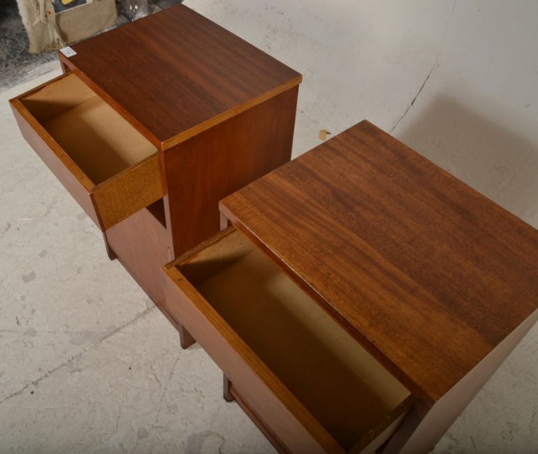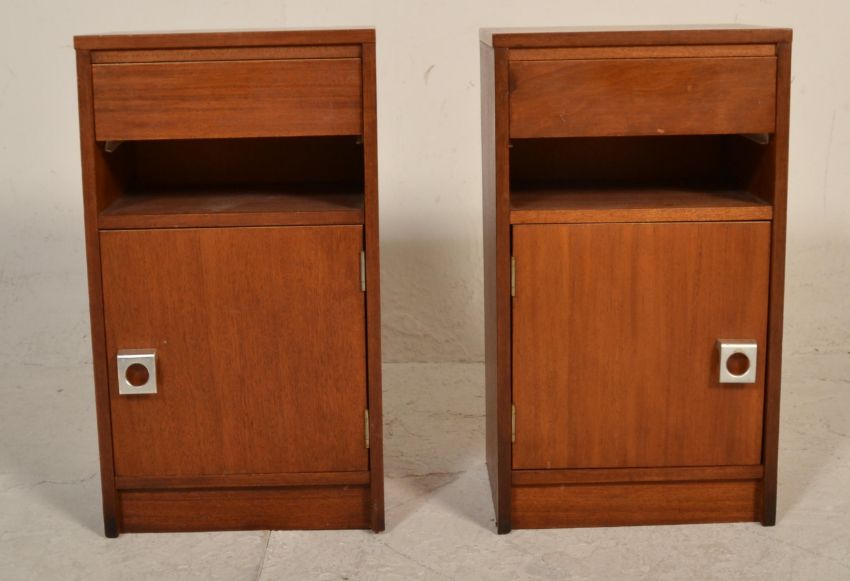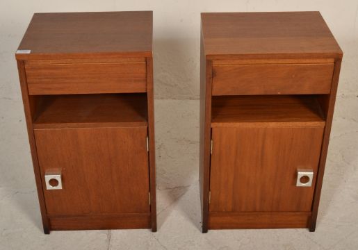 A matching pair of vintage retro 20th Century teak wood bedside cabinets having an open space above cupboard space housed by a single door. Measures 67cm tall by 38cm wide and 30cm deep.
