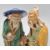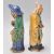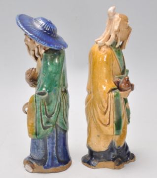 A pair of 1920's Chinese export Ming Dynasty style ceramic figurines in the form of two men glazed in yellow blue and green, both bearing objects. Stamped China to the bases.