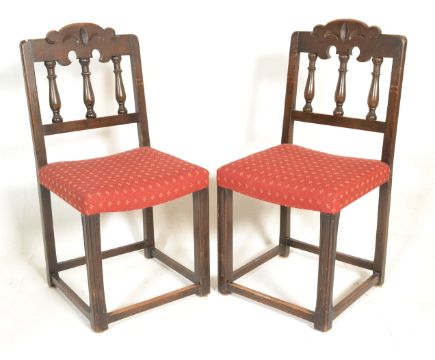 A set of 8 Ercol gothic revival early 20th century dining chairs. Raised on squared legs united by stretchers having overstuffed seats with turned column back rests and pierced top rails. To include 6 standard and 2 carvers. Caver measures 59cmsx 103cms x 48cms