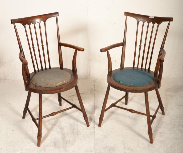 A pair of Victorian 19th century Goldsmith Windsor chairs - armchairs. Raised on turned legs united by stretchers having circular upholstered seats with lathed back rests and scrolled elbow supports