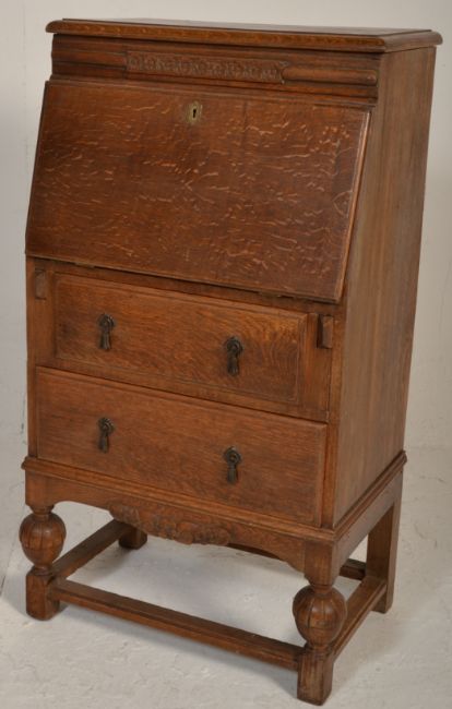 A 1920s Art Deco oak bureau decorated with a floral pediment top set over a fall front writing bureau enclosing a sectioned interior above two drawers upon carved bulbous feet connected by stretchers. Measures 110cm tall by 59cm wide and 40cm deep.