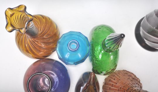 A mixed selection of vintage retro studio art glass vases of various colours and designs. Some twist examples with one having a textured finish in an orange colourway, a purple examples having a tapering neck and squat globular body etc. Measures 50 cm tall.
