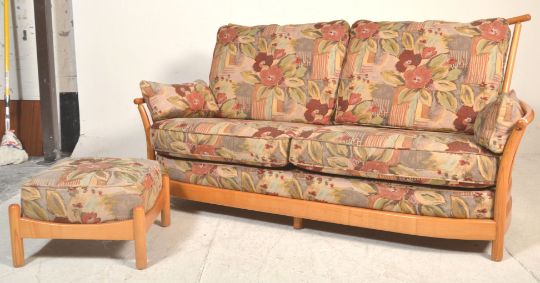 A good Ercol Saville light elm three seater sofa settee having raised spindle back with shaped arms and fabric floral upholstered cushions. Together with matching footstool. Measures 98cm tall by 192cm wide and 92cm deep.
