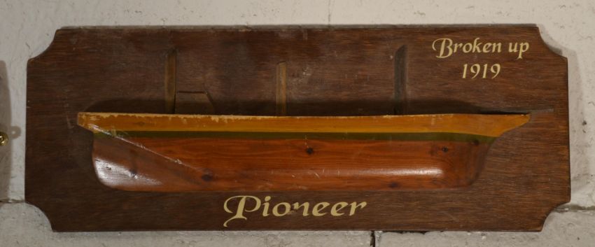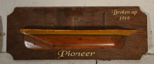 A collection of 3 wooden painted half hulls. To include Hope Town, Pioneer - Broken up 1919 and Kermes Bristol 1865. All on wooden panel backs with hand painted finish. Measures 23cm tall by 61cm wide.