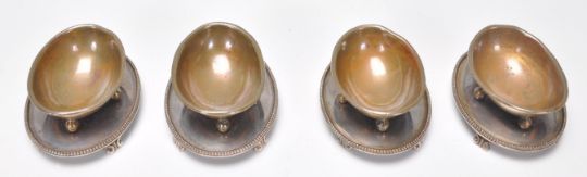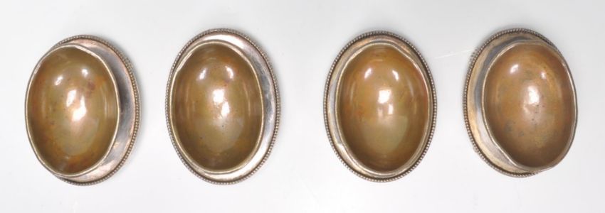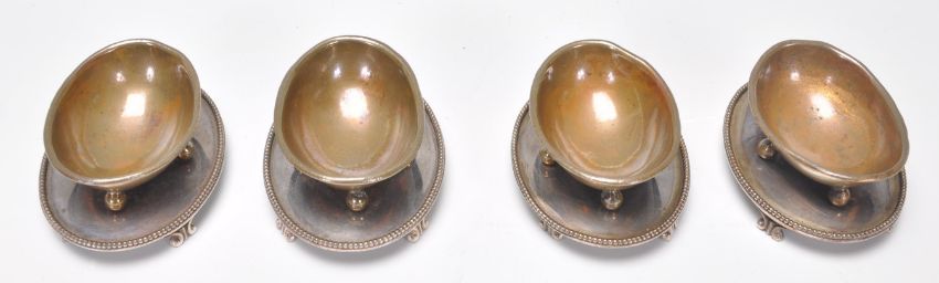 A set of 4 19th century Thomas Harwood & Sons silver plate EP and copper table salts. Each of lozenge form on scroll feet with copper bowls. Stamped for TH&S EP 6688.