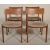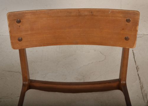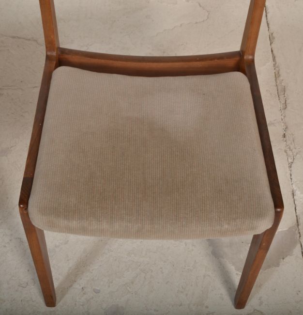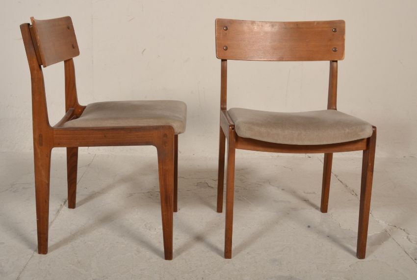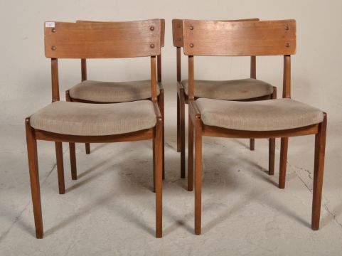 A good set of four vintage retro 20th Century teak framed dining chairs having single bentwood back rests with fabric covered seat pads and tapering legs. Measures 75cm tall by 46cm wide and 45cm deep.