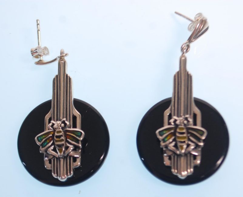 A pair of stamped sterling silver earrings set with black stone panels and bees with enamelled wings. Measures 4.5cm.