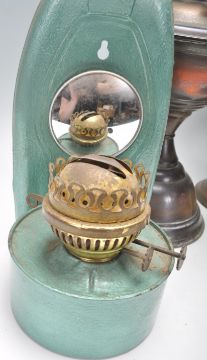 A mixed group of vintage oil lamps dating from the 19th Century to include a wall hanging example finished in metallic green having a small mirror, a brass oil lamp with repousse decoration, copper example etc. Measures 54 cm high.