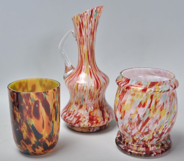 A collection of Murano 'end of day' studio art glass to include speckled vases and jugs with pulled ear decoration. Measures 20 cm high.