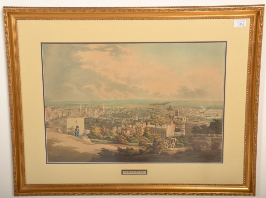 A large print depicting Old Bristol featuring the view from Cabot's hill, with some 19th Century figures visible. Print in full colour. Framed and glazed.