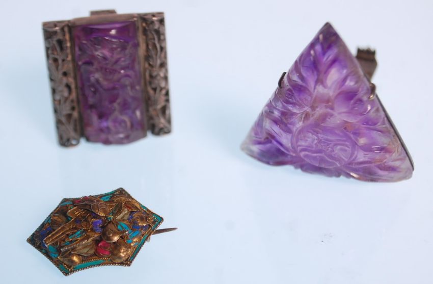 A collection of jade and amethyst jewellery to include two Chinese carved amethyst lapel brooches each decorated with carved florals, two oval jade panels set in silver with pierced decoration, a Chinese gold bar brooch set with three jade stones (tests as 9ct gold, weight 4.1g) and a Victorian bird brooch set with suspected kingfisher wing.