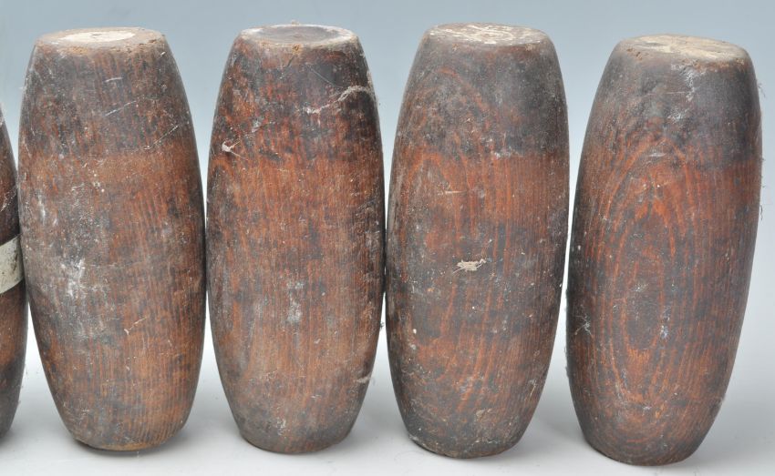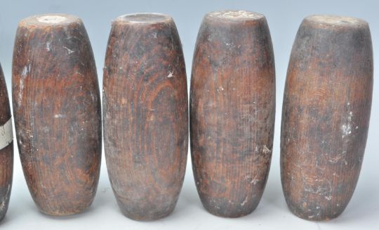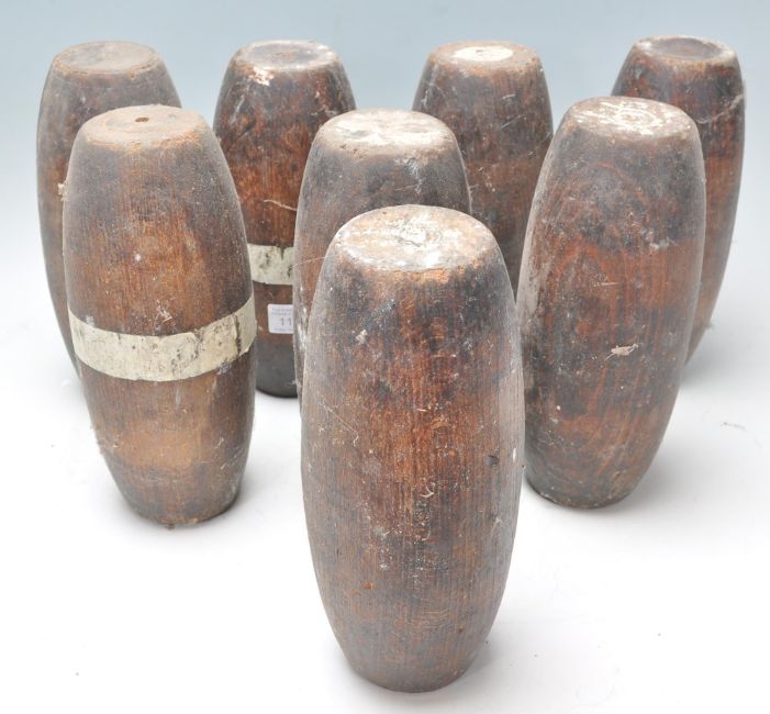 A set of 8 vintage 20th century wooden pub - village skittles - all well used by of good conical form.