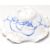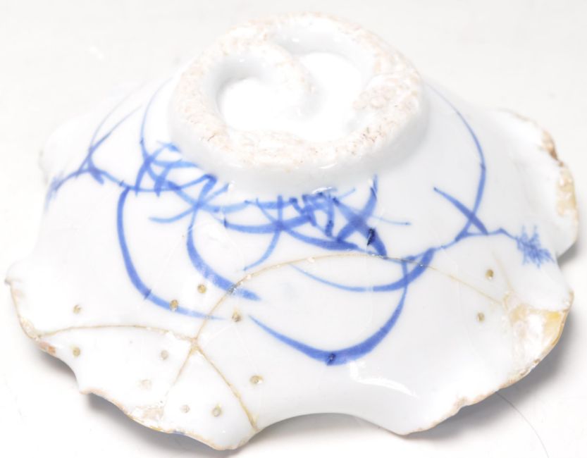 An Oriental blue and white bowl in the form of a lotus leaf with fanned edges having an applied folded lotus leaf resting on top, with hand painted details and showing signs of an early staple repair to the verso, with a moulded base in the form of a stem. The outside of the bowl is decorated with reeds and character marks. Repairs throughout.