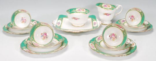 An early 20th Century part Paragon tea service having white and green ground with floral painted borders and centres. The set consisting of four cups, saucers and side plates (four trios), sandwich plate, sugar bowl and creamer / milk jug. All bearing marks to bases.