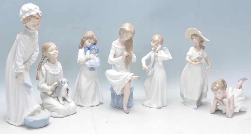 A group of seven Nao figurines to include an angel playing an instrument, a lady washing her feet, a girl seated with a puppy, a recumbent ballerina etc. All marked Nao to the bases.