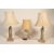 A pair of faux carved stone religious large table lamps, each with figural uprights complete with shades together with a Chinese bulbous moon flask table lamp in polychrome decoration. Measures 75 cm high.