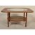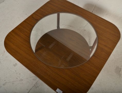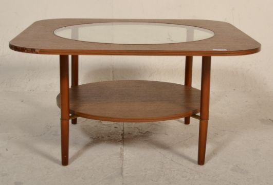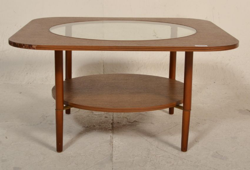 A vintage retro 20th Century melamine topped coffee table having inset circular glass top. Raised on tapering teak legs. Measures 40cm tall by 75cm diameter.