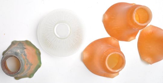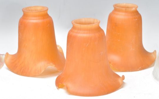 A collection of 20th century art glass lamp - light shades. To include 2 stunning art glass volcanic style, 3 orange glass shades, Factory - holophane type shades of half moon form along with others.